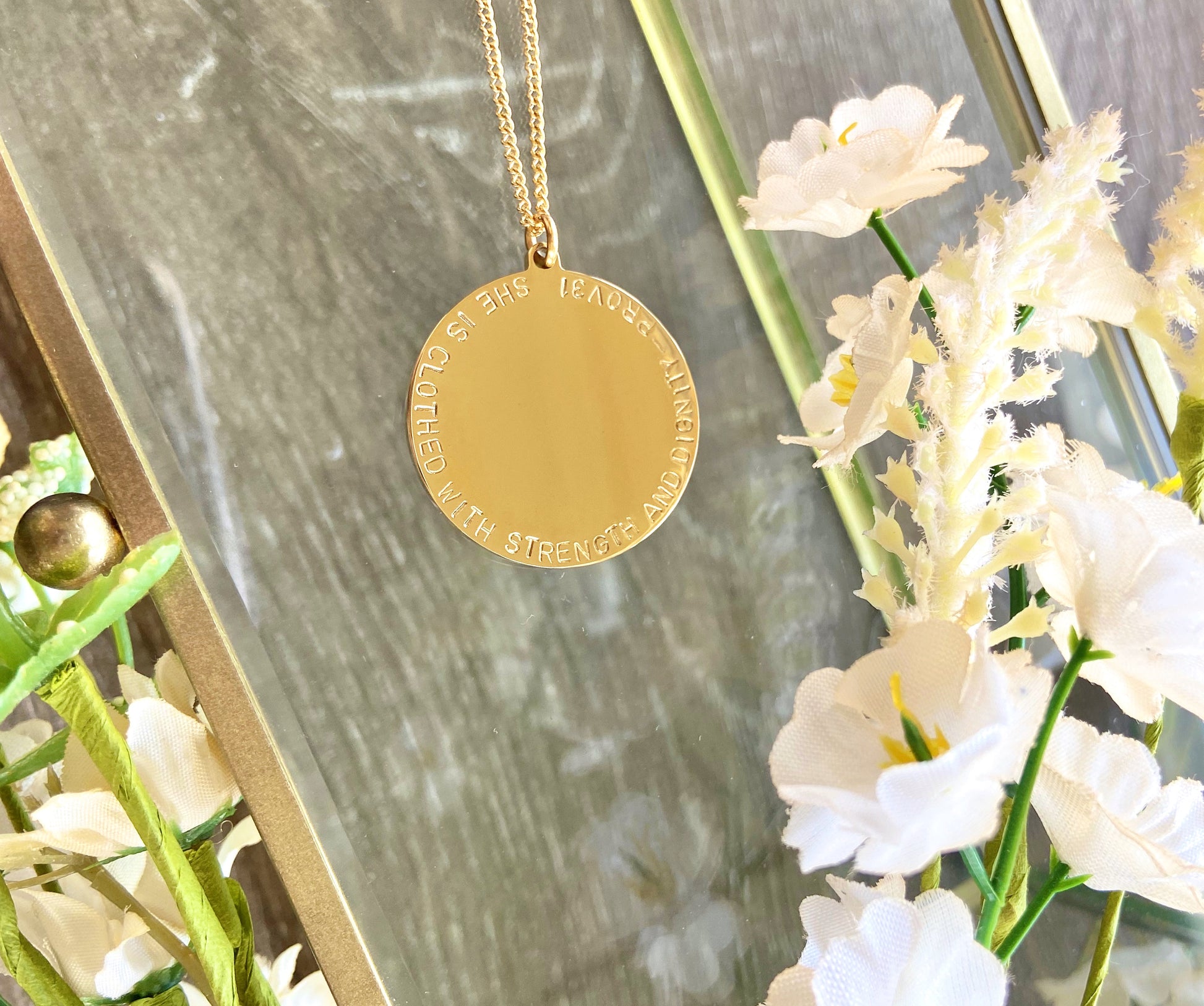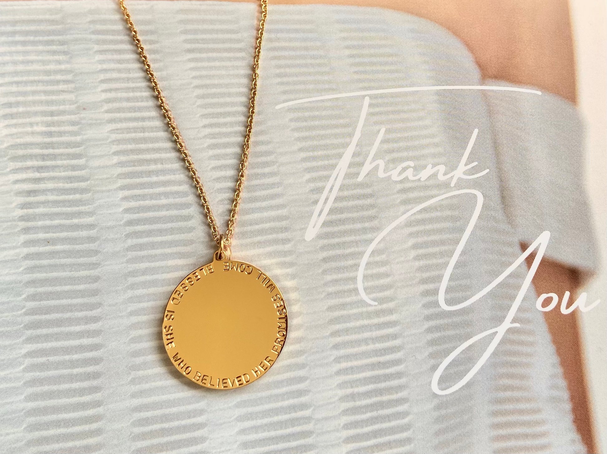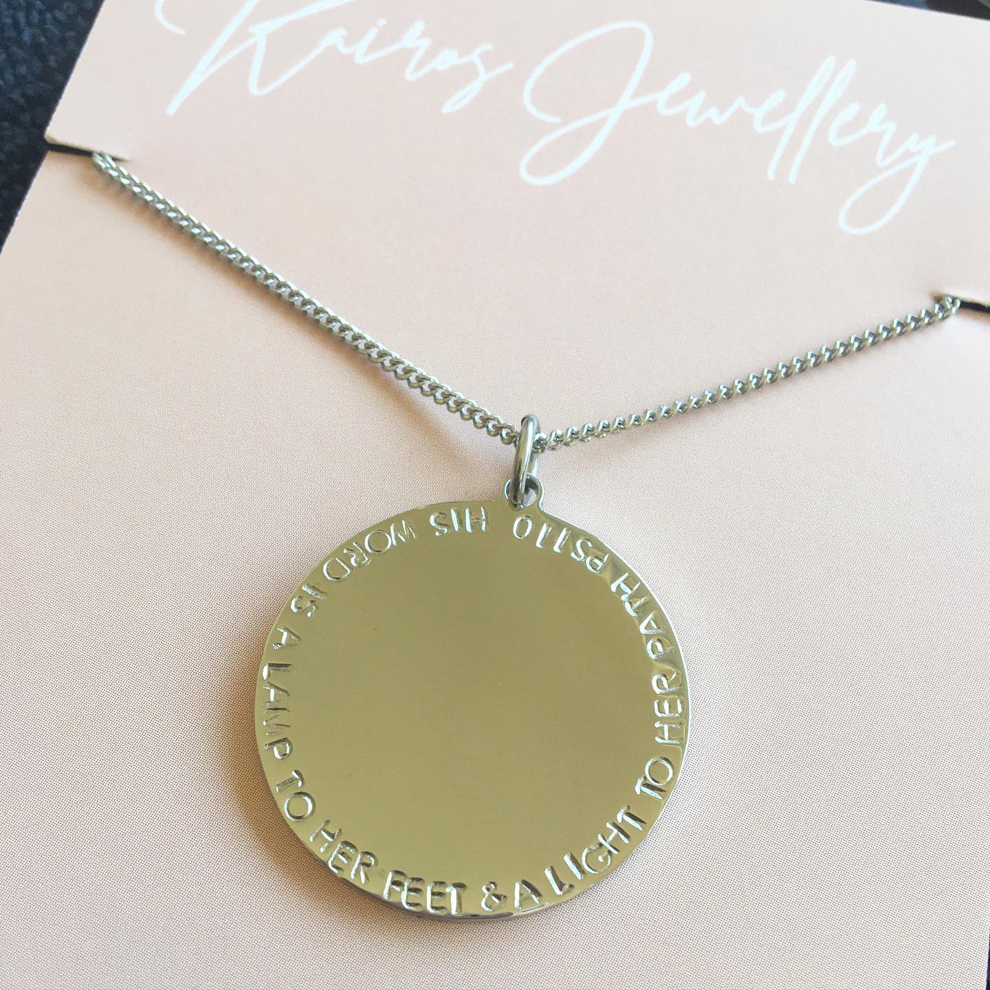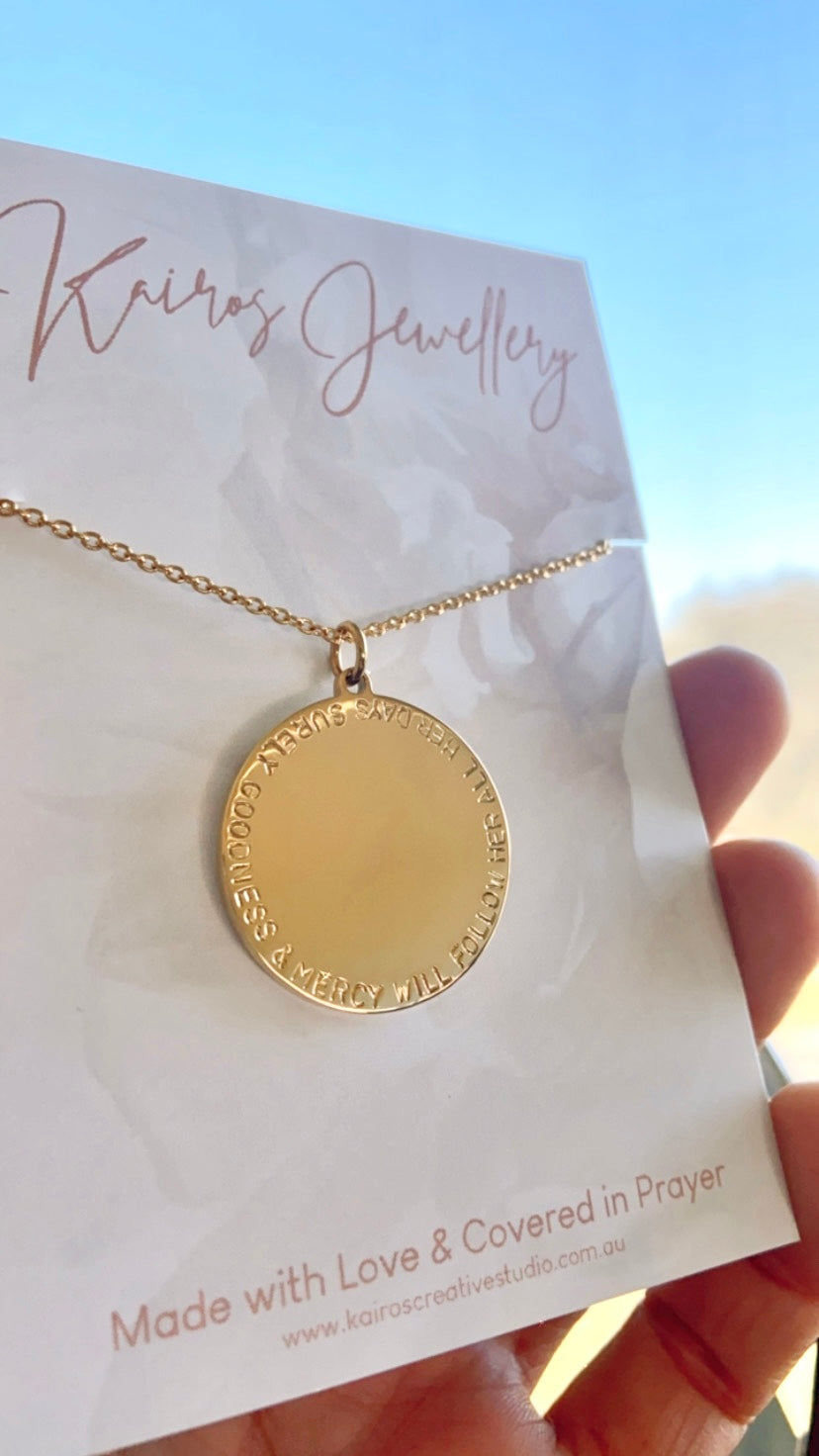 Our Mary necklace is our most popular piece year after year. It is a classy yet bold large medallion piece to wear as a powerful reminder of God's word for you in this season. Personalise our Mary necklace with a scripture, quote, personal message or request a prophetic piece, where we pray for a word for you to hand stamp on your piece