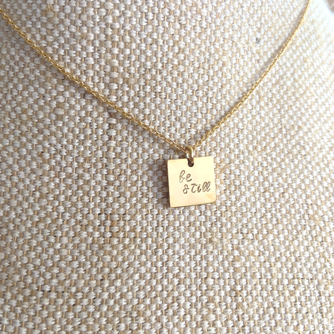 Hand stamped on our Abigail Mini Necklace is 'Be Still' in cursive font. The Abigail Necklace is made of a unique mini square pendant. A simple, elegant and unique piece to wear as a simple reminder of God's promise.