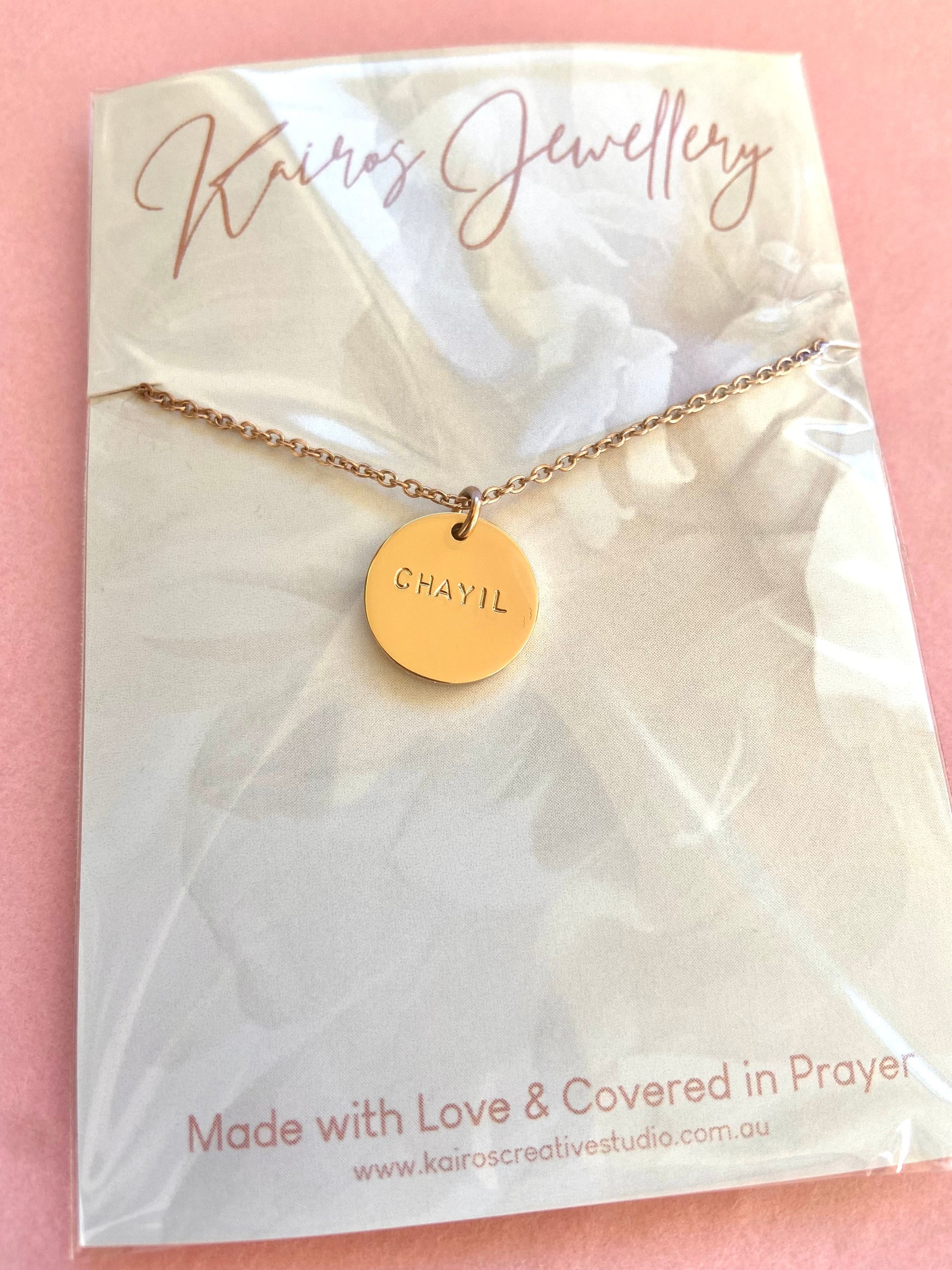 Crafted with love in our Brisbane studio, each kairos piece is carefully handstamped, polished and assembled by Marianne. Each piece is made with love and covered in prayer. As each letter is hand stamped, there will always be variation in alignment and spacing. What is unique and beautiful about this process is that each kairos piece one of a kind.