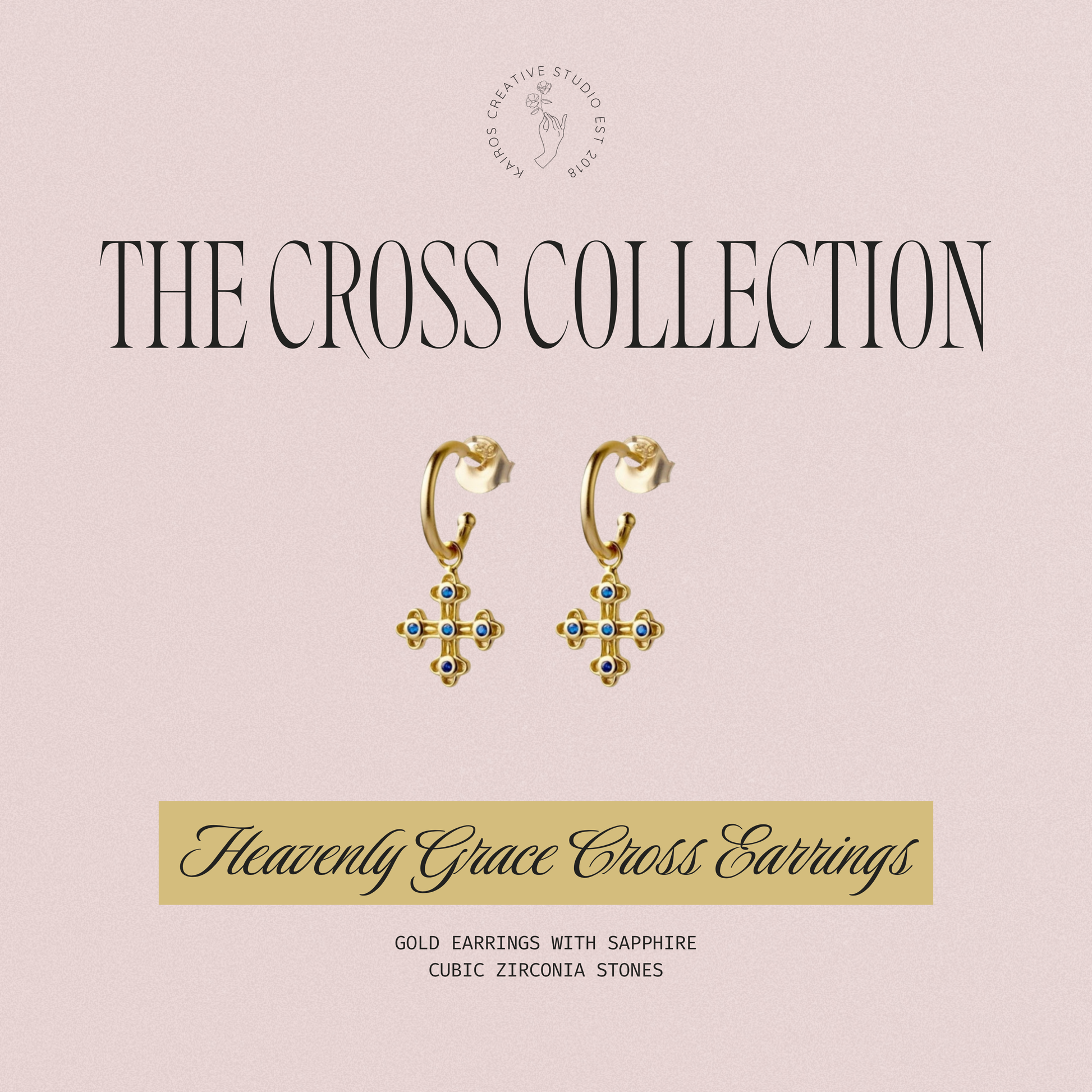 The Heavenly Grace Cross Earrings are simple and beautiful in design. They are available in 925 sterling silver plated 14k gold half hoop earrings with sapphire cubic zirconia stones. Cross earrings size 23mm X 12mm
