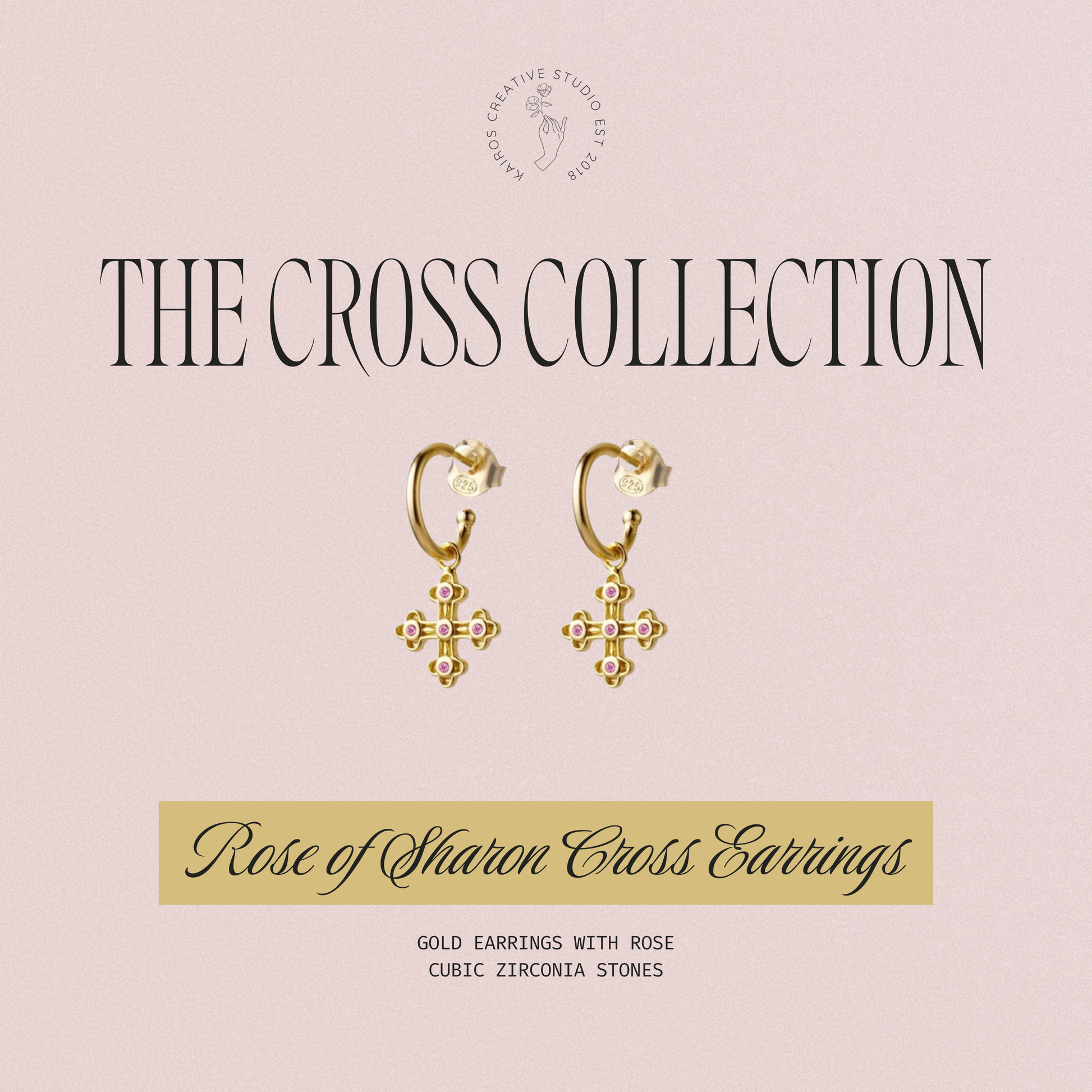 The Rose of Sharon Cross Earrings are simple and beautiful in design. They are available in 925 sterling silver plated 14k gold half hoop earrings with rose cubic zirconia stones. Cross earrings size 23mm X 12mm