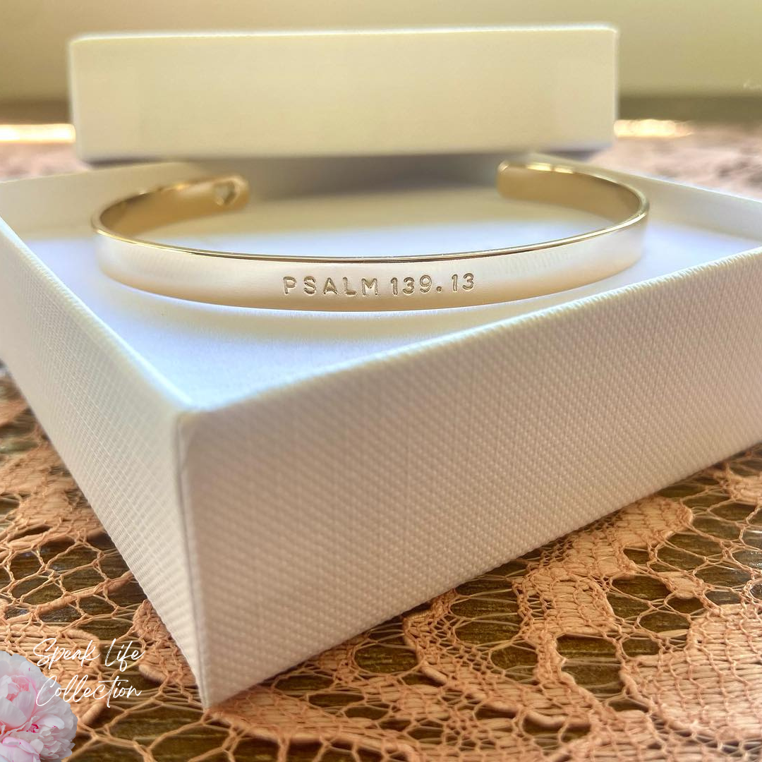 Our 'Psalm 139:13' Bracelet Cuff is inspired by Psalm 139:13 'For you created my inmost being; you knit me together in my mother's womb. I praise you because I am fearfully and wonderfully made'