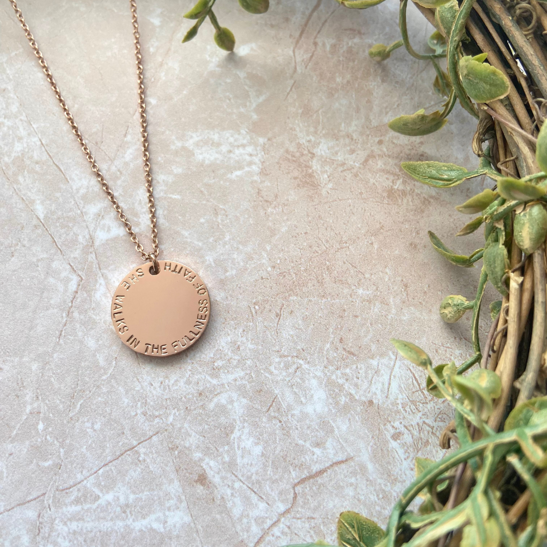 - This piece will be handstamped with 'She Walks in the fullness of Faith' as pictured.